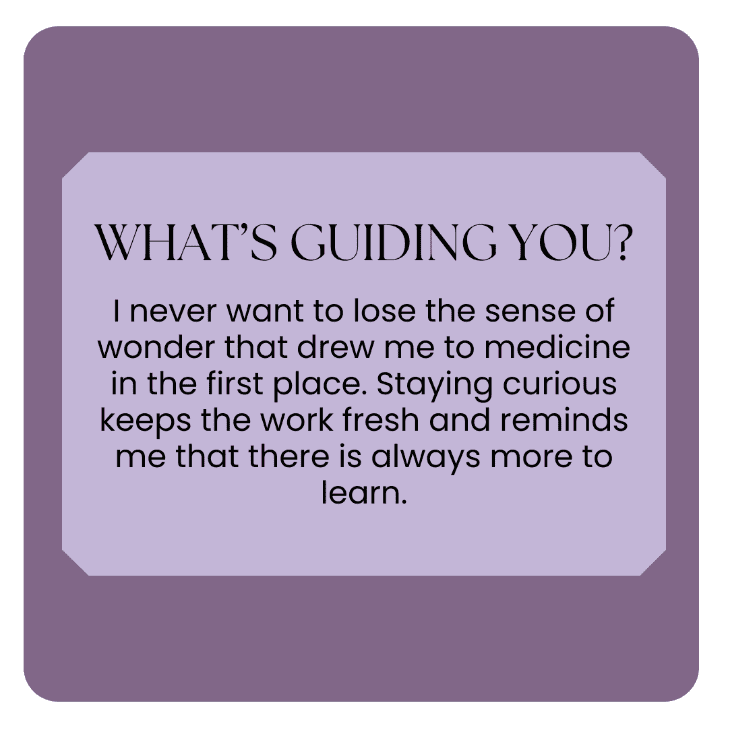 And finally, curiosity. I never want to lose the sense of wonder that drew me to medicine in the first place. Staying curious keeps the work fresh and reminds me that there is always more to learn — from science, from colleagues, and from patients.